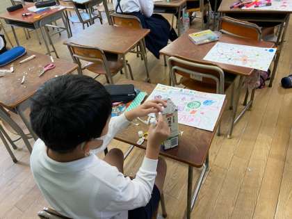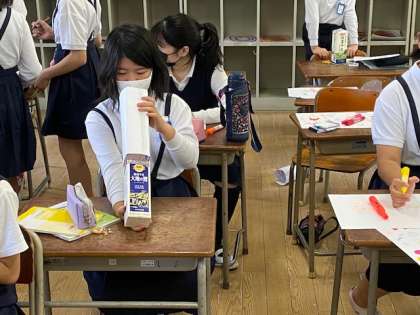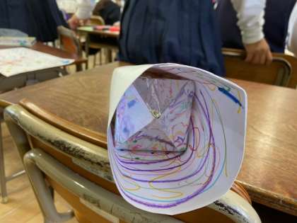 牛乳パックにはさみを入れ、アルミホイルを反射板にした、ちっと変わった万華鏡をつくってみました。みんな独創的な絵柄が映る作品をつくってくれました。