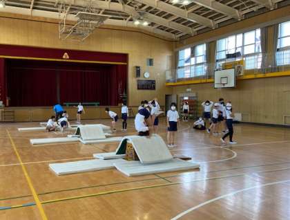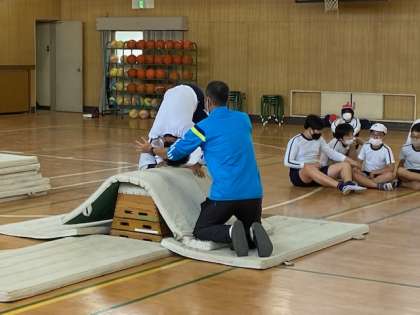 いま6年生の体育では、とび箱上での前転について取り組んでいます。けがのないよう手をつく位置など、先生からしっかり教わっています。何度も挑戦するなかで上手に回転できるようになってきています。