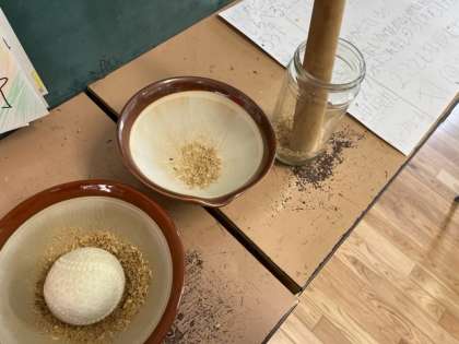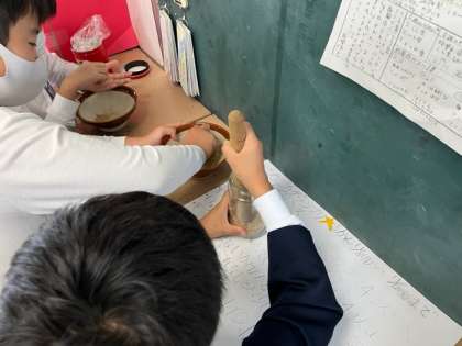 休み時間に5年生の児童が、もみがらのついたお米を、すりこぎや野球ボールですったりついたりしています。近々、家庭科の授業でお米を炊くとのことで、その準備だそうです。