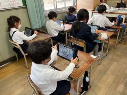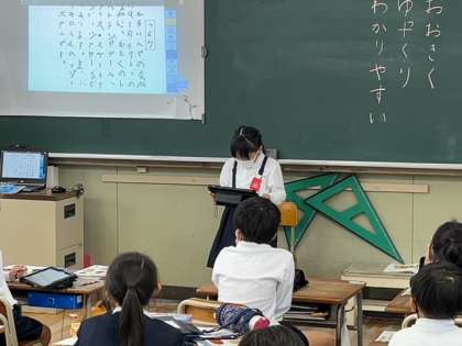 好きな乗り物、興味がある乗り物について、インターネットで画像をさがし、説明文を自分で考えました。その説明文をタブレットに手書きして説明原稿とし、何度も声に出して説明の練習を重ねたうえで、みんなの前で発表しました。「きんちょうした〜」という声はありましたが、みんな上手に説明ができていました。