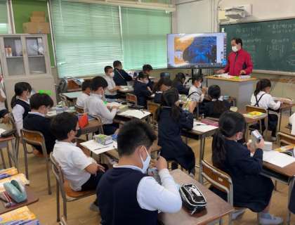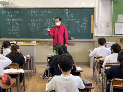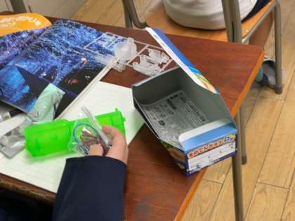 身の回りにある明かりをみんなで考えました。先生から実際に自分で明かりをつける実験のためのキットを配ってもらい、どのようなしくみで明かりがつくかも教えてもらいました。