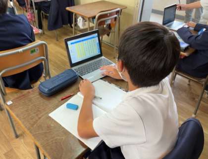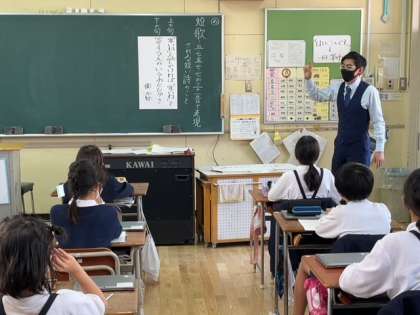 今日から短歌についての学びを始めました。三十一音で心の動きを表すことの趣きを子どもたちには感じてほしいと思います。今日は先生が示した上の句に続けて、どんな言葉をつなげたいかを子どもたちに考えてもらいました。