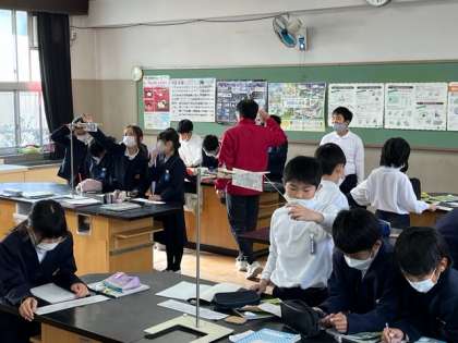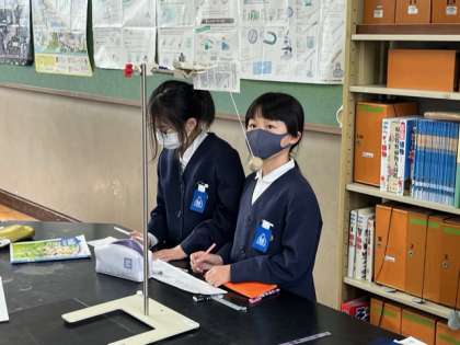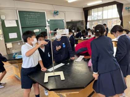 振り子を使った実験です。振り子の振れ幅を変えると一往復する時間はどうなるのか、を確かめました。みんな集中して振り子とストップウォッチとにらめっこしていました。