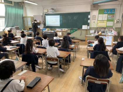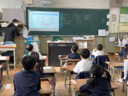 「14−8」といった計算のやりかたを先生に教えてもらったうえで、計算カードをつかって何度も計算にチャレンジしました。学級全体でもプロジェクタで映した計算式の答えをみんなで声をあわせて答えていました。