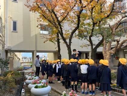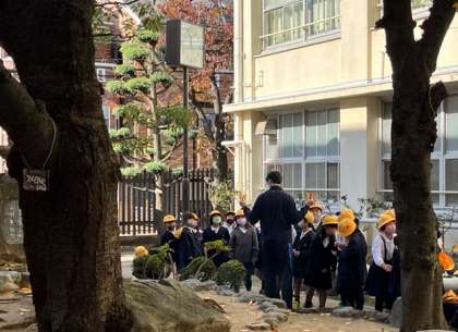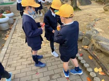 校門を入ってすぐのところに立つ樹木がきれいに色づいています。先生から日光がよく当たる場所の紅葉とそうでない紅葉とのちがいなど、いろいろと教えてもらいながら観察をしました。きれいな落ち葉を手にとってみんなうれしそうです。