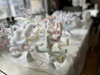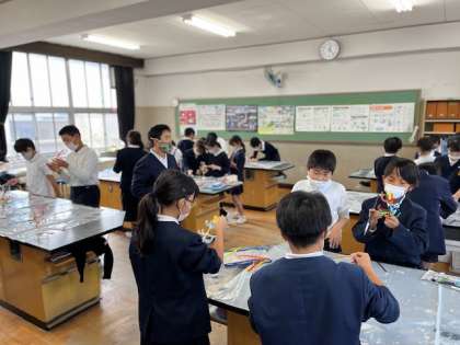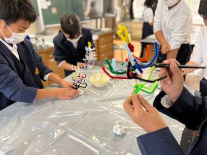 「尿素」の化学反応を利用した不思議なオブジェづくりを行いました。尿素をお湯で溶かし、そこに食器用洗剤、洗濯のりをまぜて、あらかじめモールを組み合わせてつくっておいた土台に塗っていきます。すると尿素の結晶ができ、まるで雪が積もったもみの木のようになっていきます。みんな楽しそうに取り組んでいました。