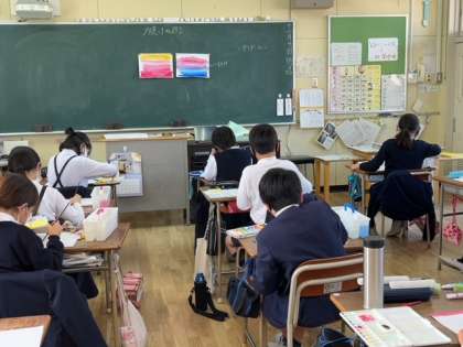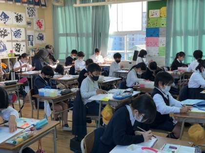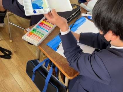 絵の具を使い、色合いを工夫して夕焼けの空、夕焼けの街を表現することにチャレンジしました。単純なようでも、みんな個性的にグラデーションを表現していて見ていて楽しく感じました。