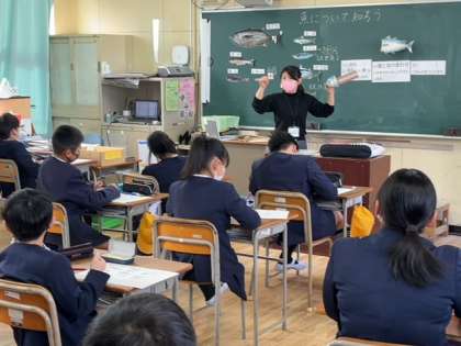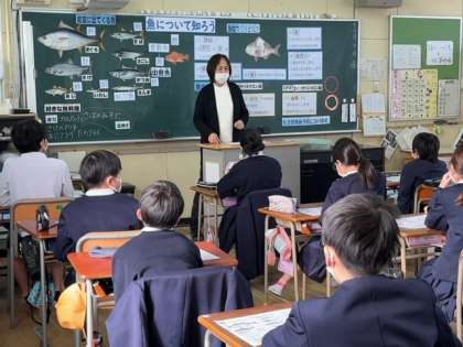 栄養教諭の先生に来校してもらい、魚の栄養について学びました。魚の種類や部位によって主な栄養素がちがうことなどを図や模型を使いながら教えてもらいました。これからは食事で魚が出てきたとき、栄養について思い出してもらえればと思います。