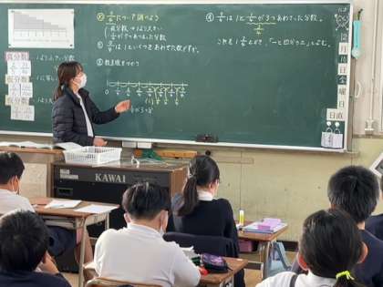 これまで、真分数、仮分数について学んできたなかで、今日は新たに帯分数という表し方を先生から教えてもらいました。「整数と真分数であらわされる分数」ということをしっかりと頭に入れてくれたものと思います。