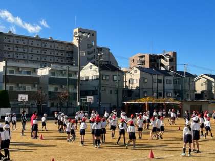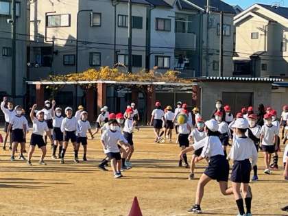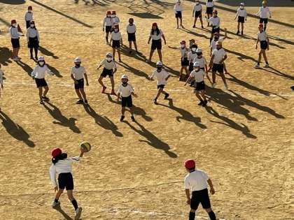 本日は「おもいっきり遊ぼう集会」の開催を設定しています。2学年ずつ一緒に校庭で、ドッジボールをして、おもいっきりからだを動かします。1時間目は3,4年生、2時間目は1,2年生、3時間目は5,6年生です。写真は1時間目の様子です。楽しそうな歓声にわきおこっていました。