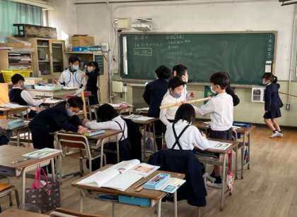 長い長さをはかるために、今日は1メートルのものさしを使って、色々なものの長さを測ってみました。つくえの縦、横、高さなど、各グループで協力をしながら調べていきました。