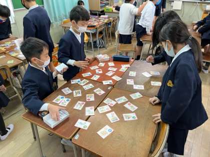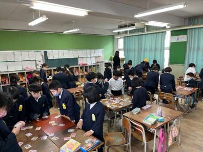お正月らしく、班ごとにカルタとりを行いました。使ったのは「日本昔話かるた」と「なにわあきないかるた」です。楽しみながら、ことわざなどの言葉の学びを深めることができたようです。