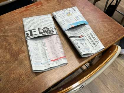 3年生は新聞紙で防災用のスリッパをつくりました。そのスリッパで医師がしきつめられた場所を実際に歩いて、役にたつことを実感してもらいました。