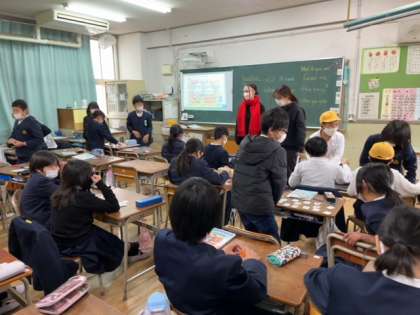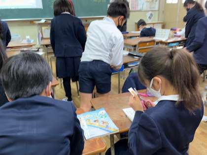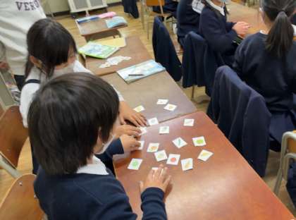くだものや野菜のカードを切り取り、それを並べて、そのカードをもとに、何をいくつほしいかを英語で話すという学習を行いました。おなじみの野菜やくだものの英語での呼び方を学ぶことが、みんな楽しみながらできたようです。