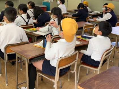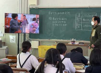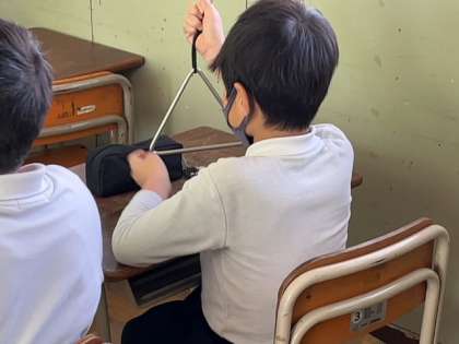 トライアングルといった楽器の音や、虫が羽をこすり合わせて出す音など、音が出ているときの様子をみんなで学びました。トライアングルもどこをどのようにもつかによって音が変わることを確認しました。
