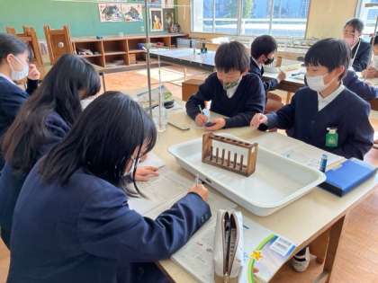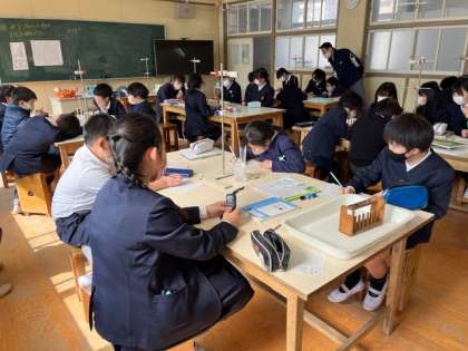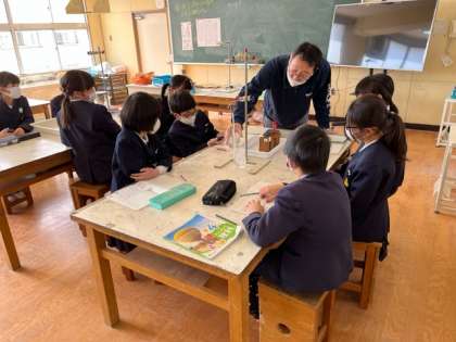 氷を入れたビーカーに水をそそぎ、時間の経過とともに温度がどうなっていくかを観察しました。2分、4分・・時間ごとに温度計をのぞき込みます。結果から何がわかるかをみんなで考えました。