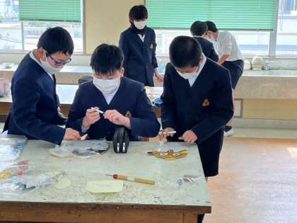 キットを使い伝言板づくりに取り組みました。自分の好きなデザインをおこして、電導の糸ノコギリを慎重に使って形を切り取っていきます。絵の具を使って色を塗り、紐を通す穴をキリで開けたりして、みんな思い思いの伝言板を作成していきました。