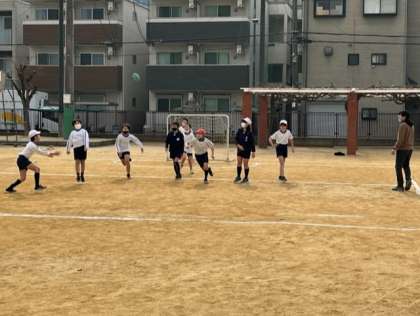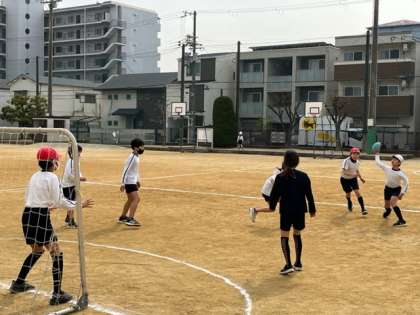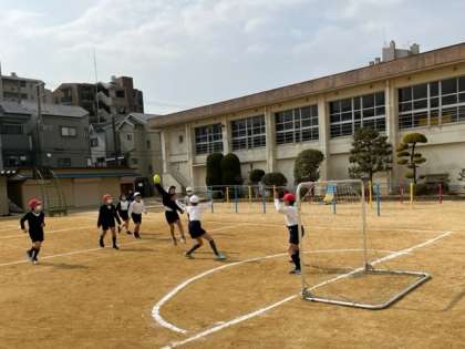 5年生はハンドボールでからだを動かしました。チーム内で声を出し合い、上手にパスをまわして、シュートを決めていました。
