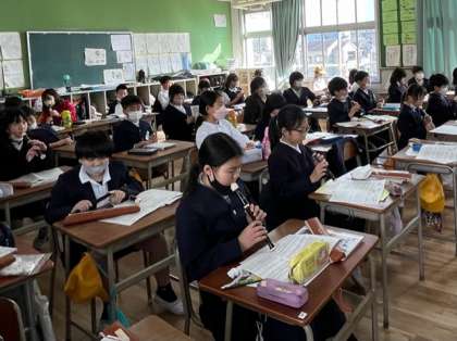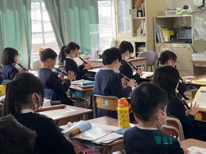 感染症予防に配慮しながら、「もみじ」「茶色の小びん」といった曲をリコーダーを使って奏でました。音の重なりを感じながら演奏することをこころがけました。
