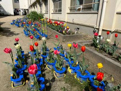 学校の桜が満開になりました。学習園に1年生が植えたチューリップも咲き誇っています。あたたかな陽ざしとともに春を感じます。