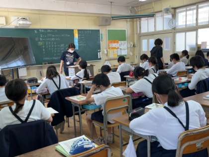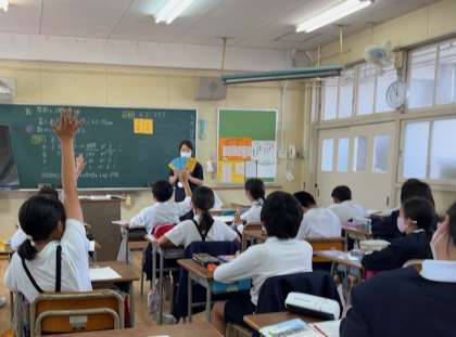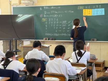 富士山の標高3776m、マラソンコース42.195kmといった数字を位ごとに分解して、整数と小数のしくみについて考えていきました。みんな積極的に手が上げています。
