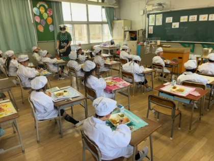 今日の給食は焼きそばでした。1年生も静かに食べることができています。