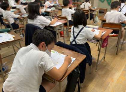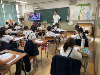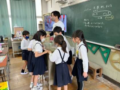 校内を探索して見つけた昆虫や植物などについて、そのようすを報告しあいました。学級で飼っている蝶の幼虫の成長もみんなで確認しました。