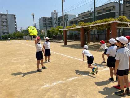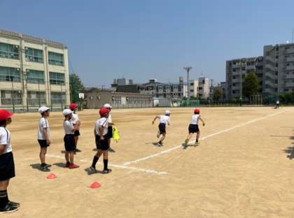 50メートル走の時間を計測しました。自分のタイムに一喜一憂する姿に、子どもたちのがんばりを感じます。