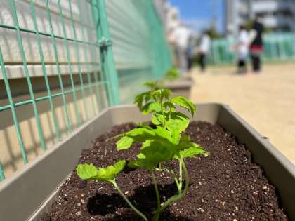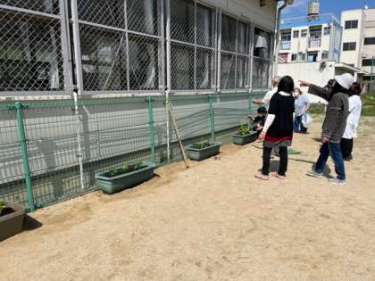 いきいき教室の先生方が教室の南側に「ゴーヤ」の苗を植えてくれました。これから夏場に向け陽射しが強まっていくのに備えて、ゴーヤの弦や葉っぱで緑のカーテンをつくろうという考えです。植物の成長の勉強もできますね。