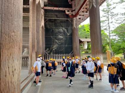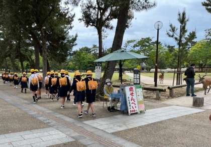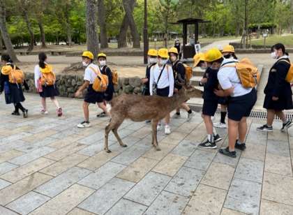 今津小学校における春の校外学習が始まりました。今日は6年生が奈良公園、東大寺へ出かけました。学校を出るときに降っていた雨も近鉄奈良駅に到着した頃にはあがり、みるみる晴天となりました。たくさんの鹿も歓迎してくれているようでした。