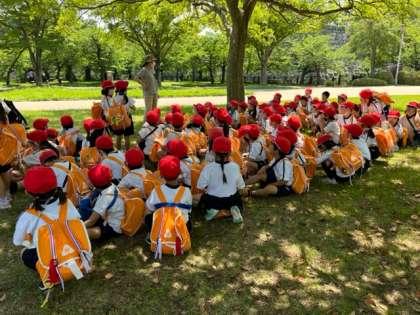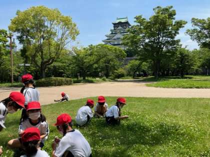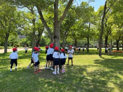 先生からの注意を聞いてから、班ごとの自由行動です。庭園内の植物を観察したり、鬼ごっこをしたり、みんな仲良く過ごすことができました。