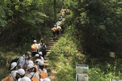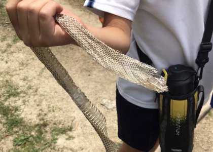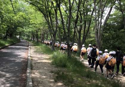 お弁当を食べたあと、子どもたちは虫やトカゲを探して大はしゃぎです。なかには、「ヘビの抜けがらを見つけた〜」と見せにくる児童もいました。帰り道もみんな元気で遊び足りない様子でした。今日の経験を7月の林間学習に活かしてくれるものと思います。