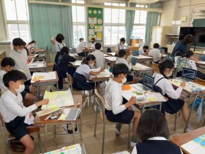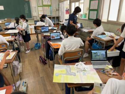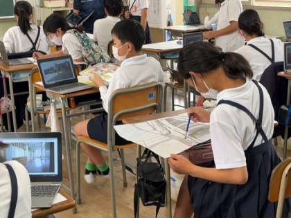 タブレットPCのカメラで撮影した学校の日常の風景を絵に描きうつしました。子どもたちの個性が伝わる味わい深い作品がいくつもできあがっていきます。