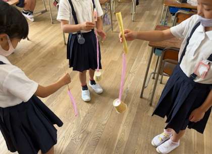 紙コップや紙皿を使って、けん玉遊びのおもちゃをみんなで手作りしました。簡単には上手くのらない(ささらない)ようでしたが、みんな楽しそうです。デザインも工夫していました。