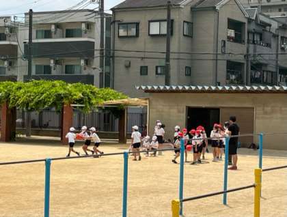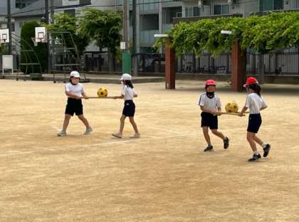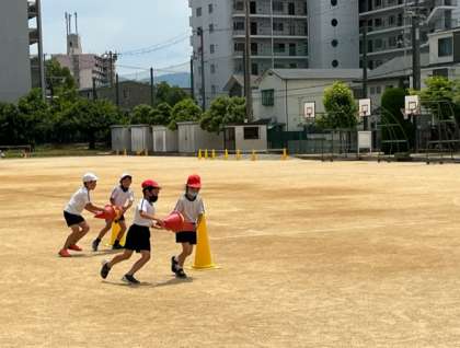 サッカーボールをカラーコーンではさんだり、2本の棒の上にのせたりしながら、運び合う運動をしました。友だちと息を合わせて、上手にボールを運ぶことができていました。