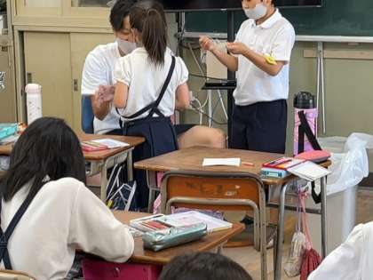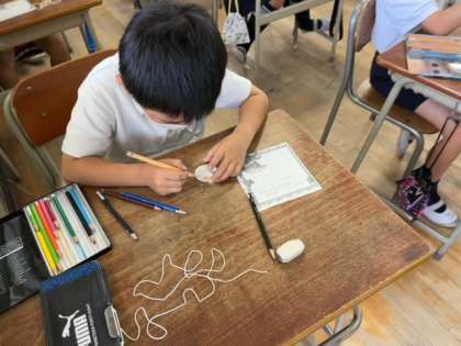 円形の厚紙に穴をあけて紐を通し、紐の両端を外側に引っ張ってあそぶ「ぶんぶんゴマ」をつくりました。回転する紙の部分の色付けにみんなの工夫がみられました。