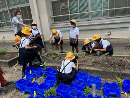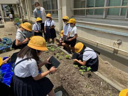 学校園の花壇に植えた「ひまわり」と「ほうせんか」が順調に育っています。3年生は、その様子をタブレットPCで写真に撮り、記録しました。花が咲くのが今から楽しみですね。