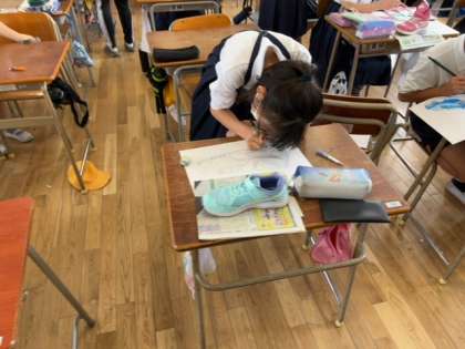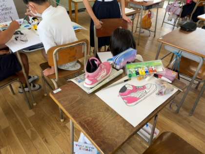 靴をデッサンし、絵の具で色を付けていきます。生地の質感、しわなども丁寧に描いていました。かっこいい作品がいくつもできあがっていきました。