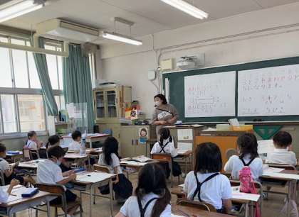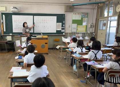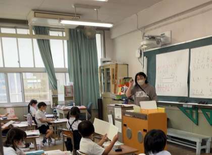 1年生の算数ではたし算を学習しています。「さかな2ひきと3びきをあわせたらいくつ?」という先生からの声がけにみんなで元気にこたえていました。