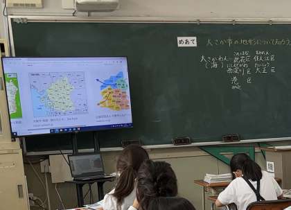 大阪市の沿岸部の地形を確認しました。埋め立てにより、人工的につくられた夢洲(ゆめしま)、舞洲(まいしま)などが大阪市の沿岸部の地形をかたちどっていることを学びました。