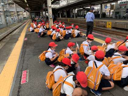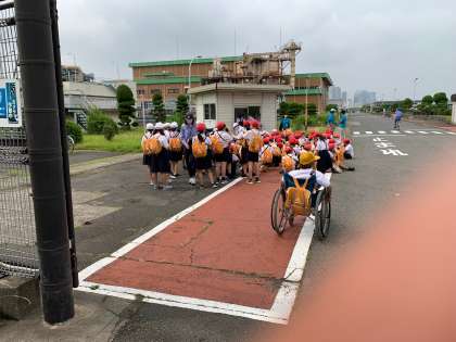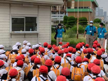 4年生は、柴島浄水場へ校外学習に出かけました。徳庵駅からJR、阪急電鉄に乗車し、浄水場に到着しました。門を入ったところで浄水場全体についての説明を受けました。