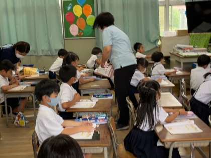 「ふえるといくつになりますか」-ブロックを使ってのたし算の学びが定着してきたようで、先生からの問いかけにも元気よく答えています。