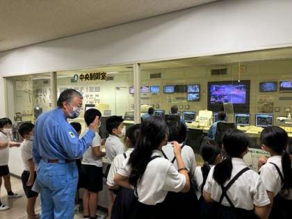 係りの方に説明を聞きながら、施設内をめぐります。中央制御室では、施設内のさまざまな場所の様子が映像ですぐに把握できるようになっていました。
