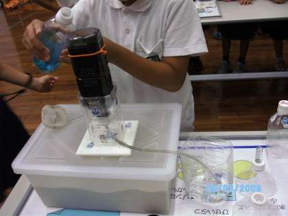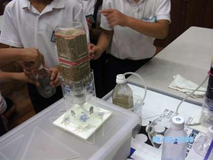 汚れた水を土や砂の層を通るときれいな水になっていきます。実際に実験をし、目で確かめることができました。