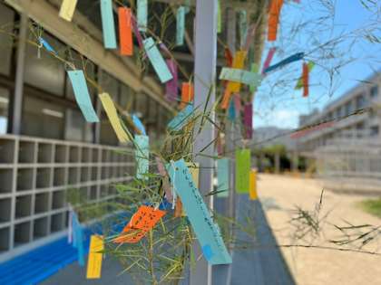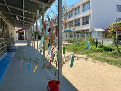 七月になりました。来週7日は七夕です。いきいき教室の前には七夕かざりが置かれました。短冊には子どもたちの願いや思いが書かれています。