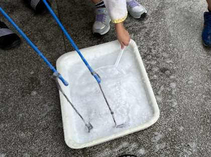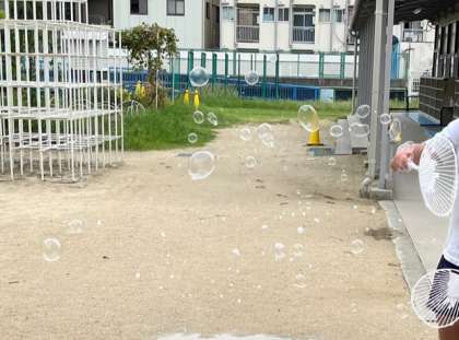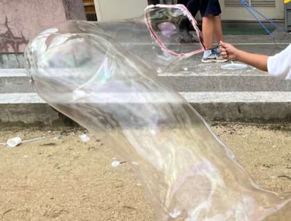 二学期になって初めての「なかよしタイム」です。しゃぼん玉用のストローのほか、うちわのホネやロープなど色々な道具を使ってしゃぼん玉づくりを楽しみました。きれいにできると、歓声があちらこちらで聞かれました。