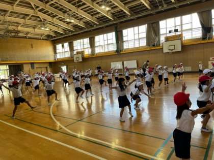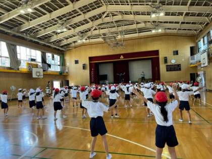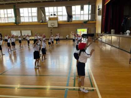 はじめての運動発表会に向けて、1年生は元気いっぱいです。団体演技の練習に楽しそうに取り組んでいます。まわりの友だちとの協調性が育つものと期待しています。