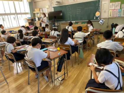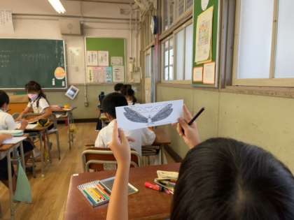 とんぼの姿をかたどった「やじろべえ」づくりをしました。型紙に書かれたとんぼに色をぬり、切り取ったものにおもりをはりつけます。できあがったやじろべえを指先にのせると、本物のトンボがとまったように見えました。
