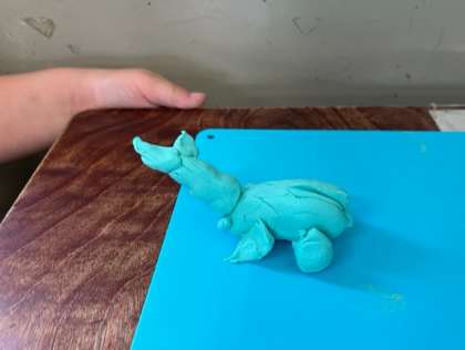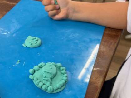 「生きもの」をテーマに、みんな思い思いにねんどでかたちをつくっていきました。池のなかの魚やカブトムシなど素敵な作品ができあがりました。