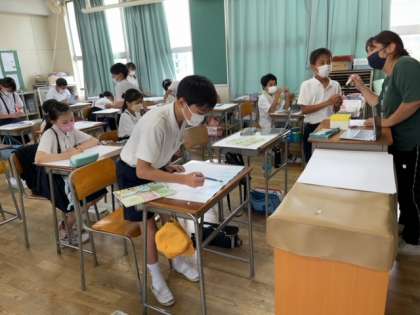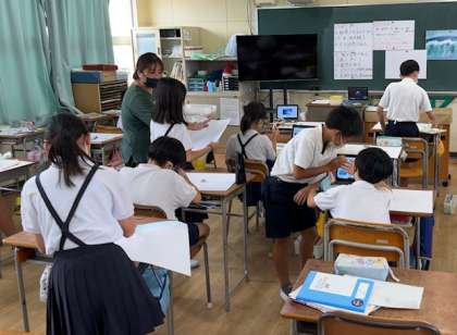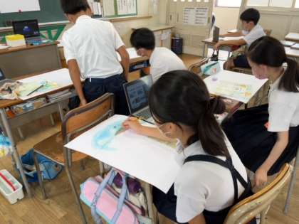夏の海をテーマに、絵の具をつかった絵画作成に取り組んでいます。色のグラディエーションやにじみを使いながら、書き上げていきます。